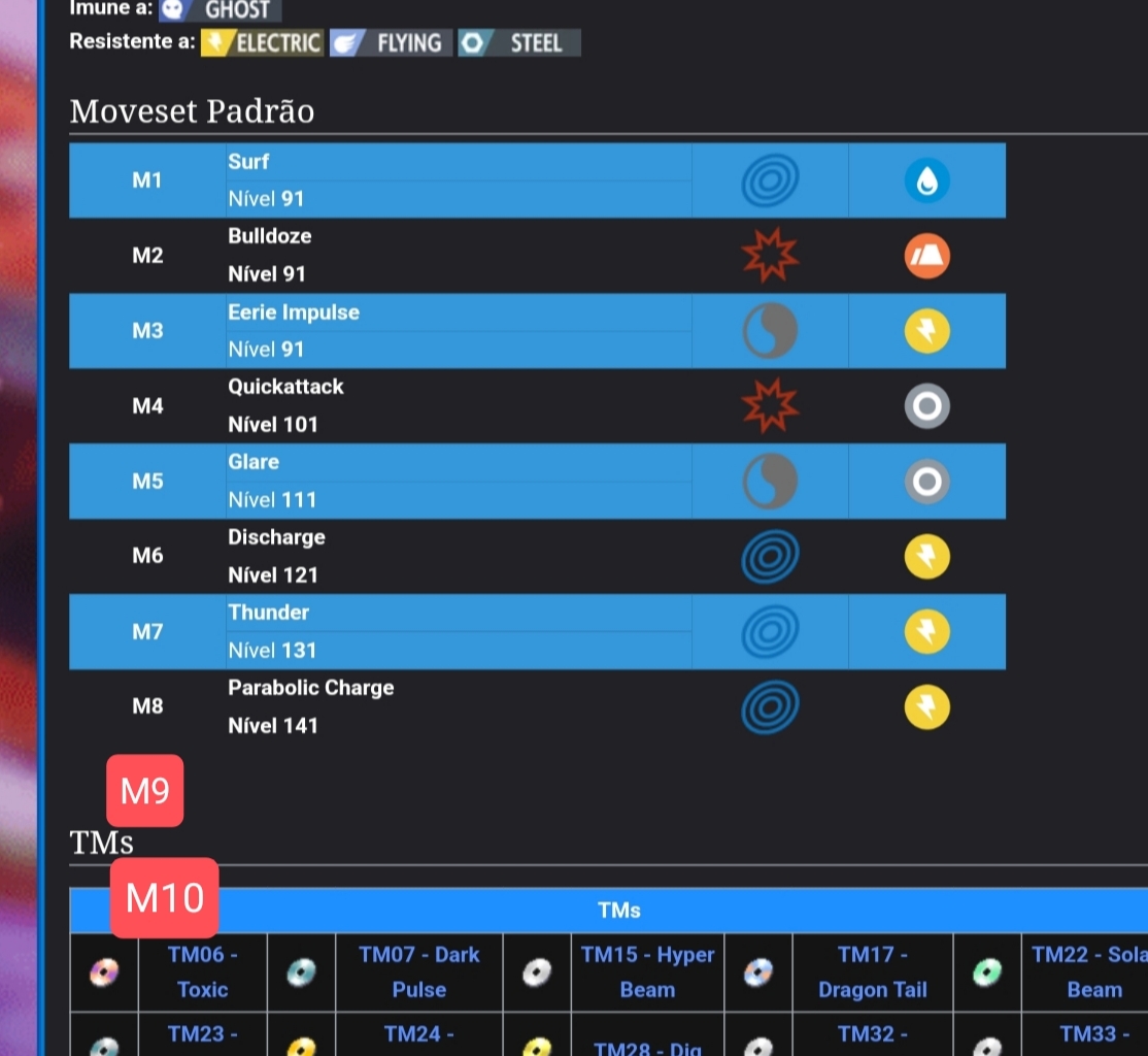 Não vou deixar de notar que há uma falta de carinho por parte de vocês por alguns pokémons. O que leva vocês a trocarem o moveset do Diggersby, e parcialmente de outros como Mamoswine ou Toxapex? Porque poucos pokémons realmente receberam um re-balanceamento enquanto a maioria dos outros apenas perdeu moves arbitrários? A melhor parte da atualização foi ver pokémons que tinham 7 moves ou menos ganhando novas habilidades e revitalizando o moveset, como houve com Sableye, Mawile, Mightyena e outros. Devido a isso, gostaria que esse sentimento fosse expandido para outros pokémons. Uma quantidade considerável de pokémons queridos e que merecem atenção já possuíam 8 moves antes da atualização, o que fez com que vocês, desenvolvedores, os ignorasse completamente. Enquanto poucos saíram ganhando ou perdendo, muito permaneceram intocados, o que é, nesse contexto, negativo, uma vez que essa atualização visa a renovação do game. Então como primeiro feedback, trago a insatisfação acerca dos pokémon que já possuiam 8 moves e então foram deixados de lado. No segundo ponto, quero tocar em um ponto: moves excelentes que são mal aproveitados por serem recentes (6a gen pra cá). Vocês, desenvolvedores, trabalharam nas últimas atualizações e gerações com carinho, e criaram dezenas de novos movimentos que não existiam antes. É justo que esses movimentos se limitem a estarem presentes apenas em um ou dois novos pokémons? É justo para o jogo que o movimento Quiver Dance, desenvolvido recentemente, esteja presente no moveset de apenas um pokémon inseto, quando na franquia ele pertence ao moveset de dezenas? Trago aqui então uma possibilidade de, aproveitar esse momento de renovação, pra expandir essa experiência para outros pokémons nessa atualização. Trago os seguintes movimentos, que cabem na descrição acima, e apresento pokémons que os aprendem oficialmente na franquia: - Quiver Dance (como já citado) Butterfree, Venomoth, Beautifly, Dustox, Masquerain, Mothim, Wormadan, Volcarona, Vivillon - Echoed Voice Wigglytuff, Chansey, Noctowl, Exploud, Chatot, Seismitoad, Cinccino - High Jump Kick Hitmonlee, Blaziken, Medicham, Lopunny, Scrafty, Mienshao, Hawlucha - Aqua Ring Dewgong, Seaking, Vaporeon, Lanturn, Azumarill, Mantine, Milotic, Gorebyss, Luvdisk, Lumineon, Seismitoad, Swanna, Alomomola -Crafty Shield Cofagrigus, Chimecho -Muddy Water Vaporeon, Quagsire, Swampert, Whiscash, Gastrodon, Seismitoad, Stunfisk - Eerie Impulse Electrode, Lanturn -Glare Arbok, Dunsparce, Seviper, Drampa, Druddigon - Aromatherapy (O ícone é a Roselia e ela e a roserade não tem esse movimento) Vileplume, Meganium, Roserade, Vespiquen, Lilligant, Sawsbuck - Cotton Guard Ampharos, Altaria, Whimsicott, Maractus -Circle Throw Poliwrath, Throh, Kangaskhan -Power Trip Cacturne, Zangoose, Krokodile -Arm Thrust Heracross, Hariyama, Emboar -Water Shouriken Accelgor!!!!! Pokémon de maior raridade e com o moveset defasado. -Shadow Sneak Ariados, Shedinja, Sableye, Kecleon, Banette, Dusknoir, Spiritomb - Needle Arm (O ícone é a cacnea, e o Cacturne não possui) Cacturne e Maractus Tem outro punhado de movimentos que foram desenvolvidos nos anos recentes e não são TM ou MT que eu poderia citar, mas vou parar nesses. Espero que vocês considerem a alterações. Tanto pra valorizar o trabalho que vocês fizeram com esses movimentos, quanto pra revitalizar o jogo e o mais importante, fazer justiça com alguns pokémons. (E eu não poderia deixar de pedir pela milésima vez, coloquem Agility no Ninjask, o pokémon mais rápido).