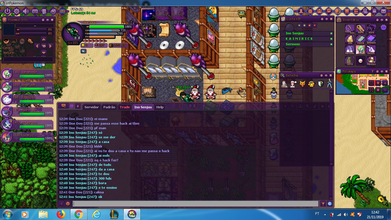 HOJE 21/11/2019 fui fazer um trade em uma house, eu ia dar uma bike + 1k + a house em um pokemon, o maluco me pediu pra colocar as coisas dentro da house e dar trade, quando eu ia dar trade ele disse que queria algo a mais e talz, quando fui abrir a porta da house pra ver uns itens o maluco entrou na house SEM MINHA PERMISSAO , ou seja, eu nao tinha dado aleta som ou aleta sio pra ele entrar, ele simplesmente entrou na house e pegou minha bike e meus hds, espero que providencias sejam tomadas, ngm merece jogar em um jogo onde tem gente que se esforça pra conseguir as coisas e outra pessoas simplesmente tomam de voce, irei deixar um print aqui mostrando ele afirmando que tem o hack, espero que alguem tome uma decisão.